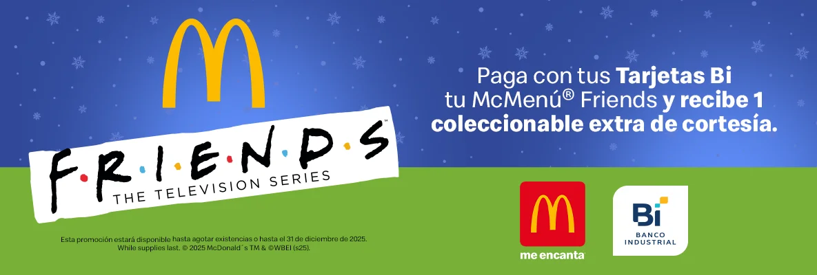 ¡La nostalgia y la diversión llegan a McDonald’s! Al comprar tu McMenú Friends y pagar con tu Tarjeta Bi, recibes un juguete extra exclusivo de la colección.